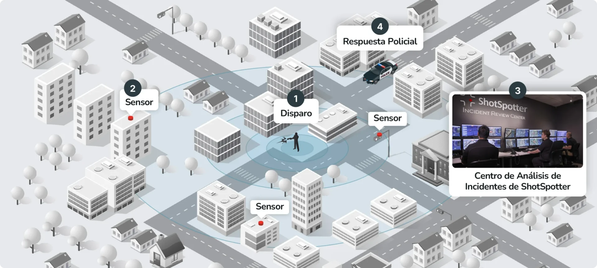 ShotSpotter es el sistema líder de detección de disparos, localización y análisis forense en el que confían más de 180 ciudades como Nueva York, Washington DC, Miami, Montevideo, Ciudad del Cabo